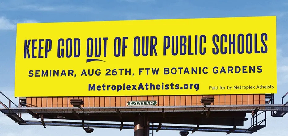 Fort Worth, Texas—The North Texas atheist group Metroplex Atheists has launched a billboard campaign to promote their educational event, “Keep God Out of Our Public Schools.” On Sunday, District Judge Reed O’Connor denied them a preliminary injunction to post banners on downtown lampposts. Nonetheless, the billboard campaign, which will run until August 24, will help promote the August 26 event. In addition, the lawsuit will continue as planned. Metroplex Atheists is represented by American Atheists and local counsel Glast, Phillips & Murray with substantial assistance from the American Humanist Association.