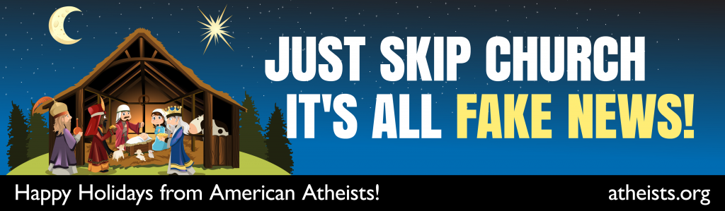 Cranford, NJ—Continuing its annual tradition of holiday season billboards, American Atheists has launched two campaigns. One urges Americans to skip church to avoid the original “fake news,” and the other advertises their upcoming national convention in Oklahoma City.