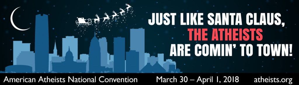 On the first billboard, an illustration of a traditional manger scene accompanies the words “Just skip church. It’s all fake news!” along with a holiday greeting from American Atheists. The second billboard shows the Oklahoma City skyline with Santa’s sleigh flying overhead and says, “Just like Santa Claus, the Atheists are coming to town!” in a reference to the 2018 National Convention in Oklahoma City, March 30 to April 1.