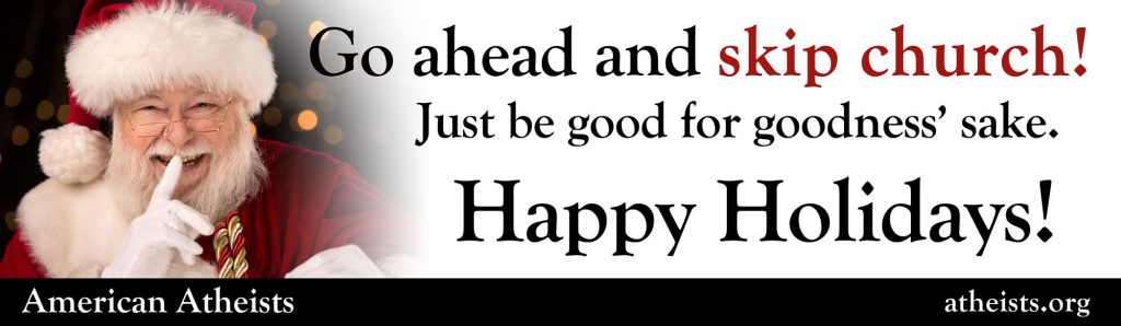 Cranford, NJ—Continuing a holiday season tradition, American Atheists has launched a series of billboards in the Winston-Salem, North Carolina area and in Colorado Springs, Colorado featuring Santa Claus urging viewers to go ahead and skip church and simply be good for goodness’ sake.
