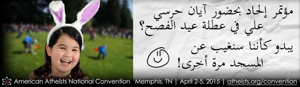 The billboard features a young girl wearing “bunny ears” with accompanying Arabic text reading, “An atheist convention featuring Ayaan Hirsi Ali on Easter weekend? Looks like we’re skipping mosque again!” and with details about the convention. A similar billboard in English was on display from March 3-10 in Memphis, reading “An atheist convention on Easter weekend? Looks like we’re skipping church again!”