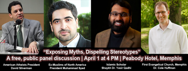 The moderated panel, titled “Exploring Myths, Dispelling Stereotypes” will include Memphis’ First Evangelical Church pastor Dr. Cole Huffman, nationally known Islamic scholar and Rhodes College professor Dr. Yasir Qadhi, Ex-Muslims of North America President Muhammad Syed, and American Atheists President David Silverman. Audience members will have the opportunity to ask questions after the panel discussion.