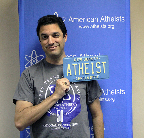 The New Jersey Motor Vehicle Commission has actually previously approved “ATHEIST” as a license plate (with I instead of 1). Here is a photo of David Silverman with an old (retired) New Jersey officially approved license plate reading “ATHEIST”: