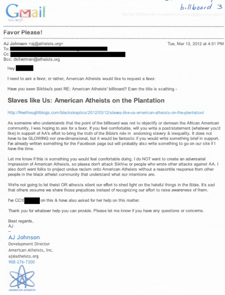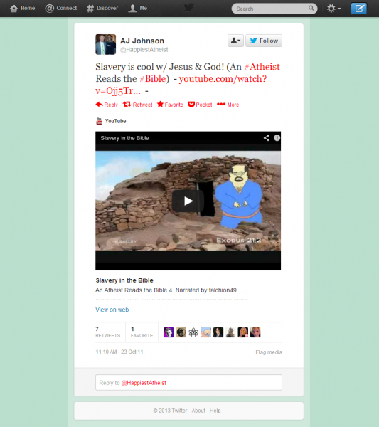In opposition to what she now asserts, Ms. Johnson publicly supported the “slaves obey your masters” billboard, which featured a biblical verse supporting slavery as a protest of the Pennsylvania state legislature’s proclamation of 2012 as the “Year of the Bible”. Ms. Johnson also volunteered to rally support for the billboard from black atheists (see below). Indeed, months before the billboard was even conceived, Ms. Johnson tweeted a video from her personal account echoing the same biblical hypocrisy about slavery (see below). In addition, Ms. Johnson was never subjected to racial jokes at any time, nor would anyone at American Atheists tolerate such behavior.