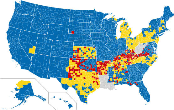 I am of the opinion that adults should be able to make up their own minds. If, for religious reasons, someone chooses to abstain from alcohol, cigarettes, caffeine, or anything else, that is her right. But passing a law that affects others in this way is against the letter and spirit of the First Amendment of the Constitution of the United States. Below, you’ll find a map of the United States showing dry (red), wet (blue), and mixed (yellow) counties.