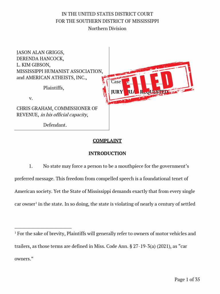 The complaint accuses the Mississippi Commissioner of Revenue of violating nonreligious people’s freedoms of speech and religion by forcing them to display this religious message on their private property.