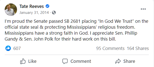 In January 2014, then-Lieutenant Governor Tate Reeves praised the state Senate’s vote to put “In God We Trust” on the state seal; he claimed on Facebook that “Mississippians have a strong faith in God,” a statement that excludes Mississippi atheists and non-Christians.