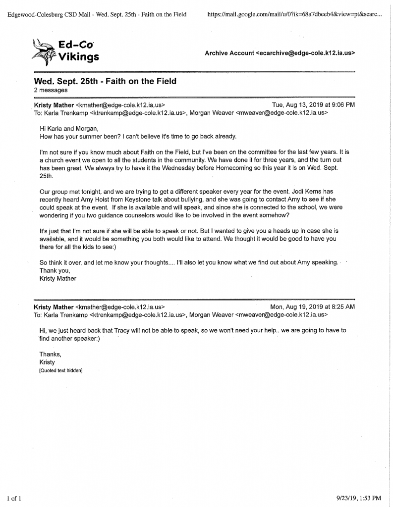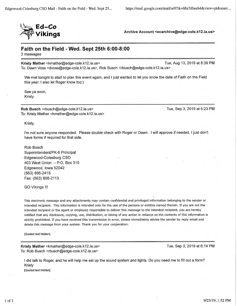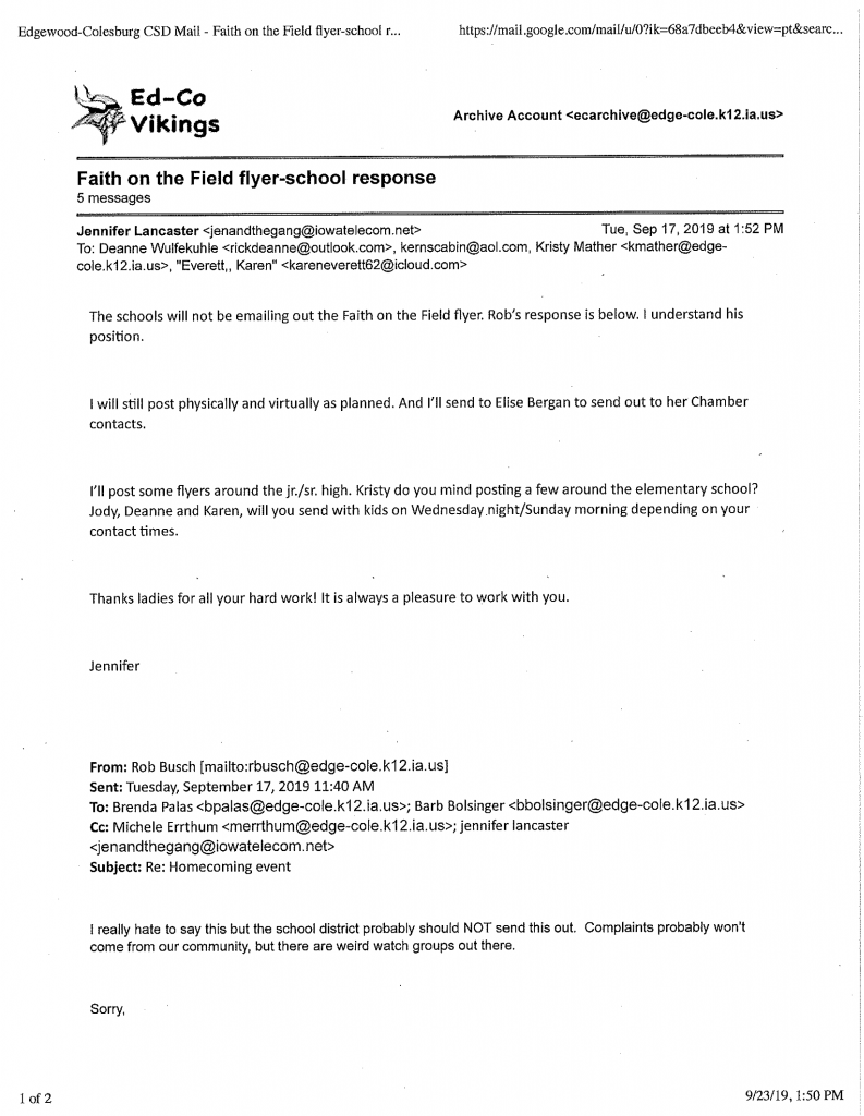 Cranford, NJ—September 25, 2019—Today, American Atheists determined that the superintendent and teachers of the Edgewood-Colesburg Community School District (Ed-Co CSD) have been unconstitutionally organizing a prayer event scheduled at 6:00 p.m. CT tonight.