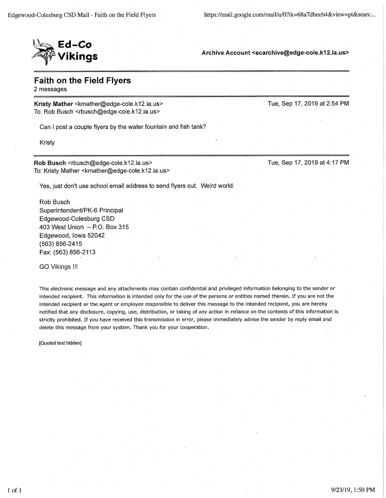 “I really hate to say this but the school district should NOT send this [event flyer] out. Complaints probably won’t come from our community, but there are weird watch groups out there,” wrote Busch. When Mather asked Busch, “Can I post a couple flyers by the water fountain and fish tank?” he responded, “Yes, just don’t use school email address to send flyers out. Weird world.”