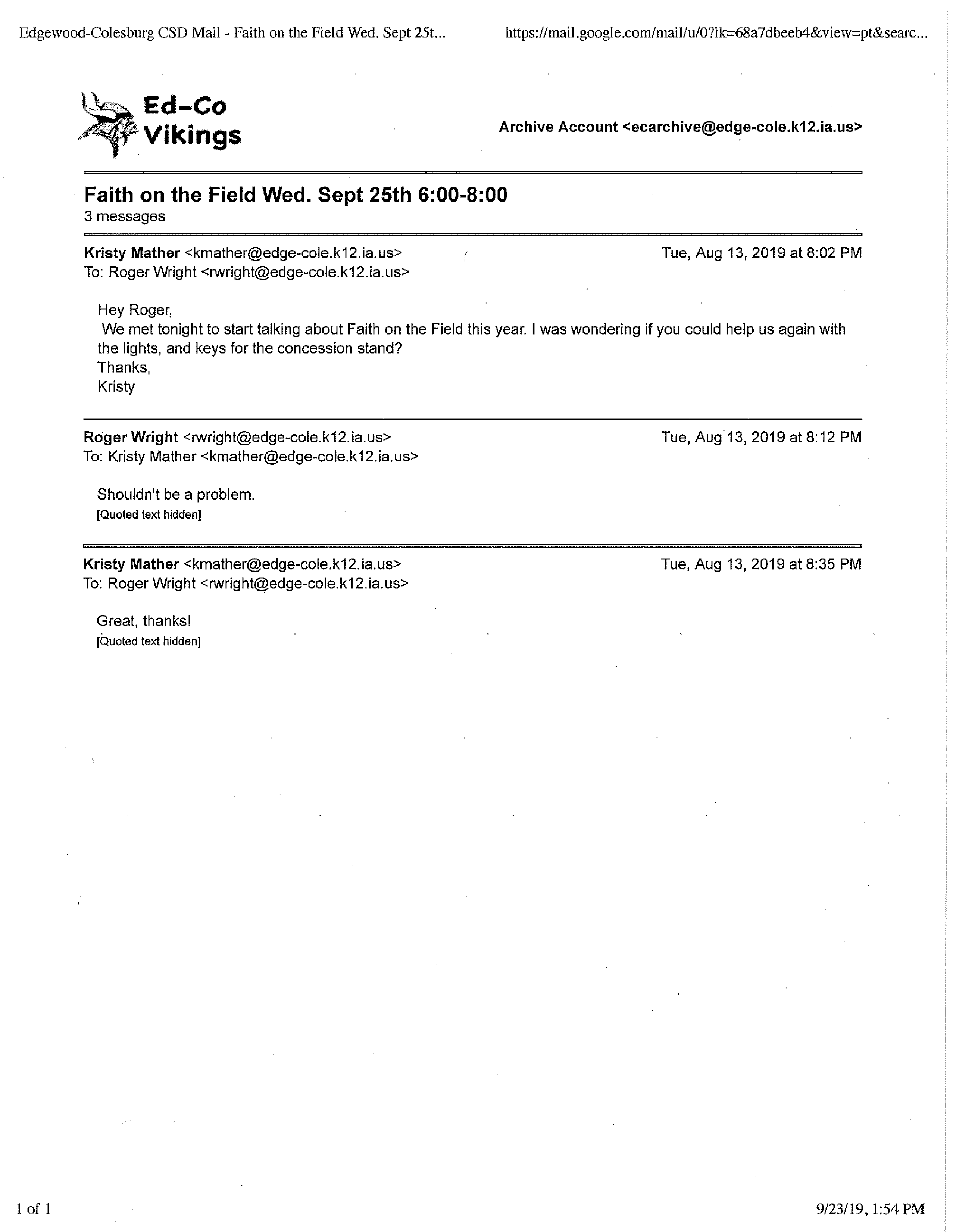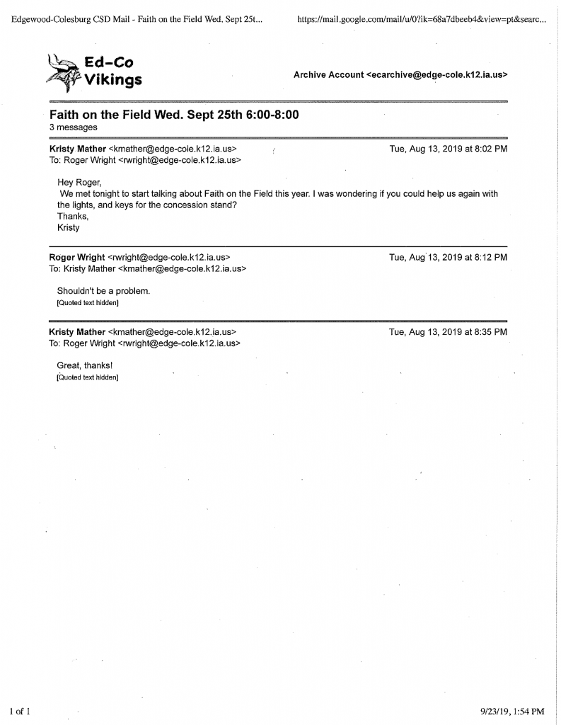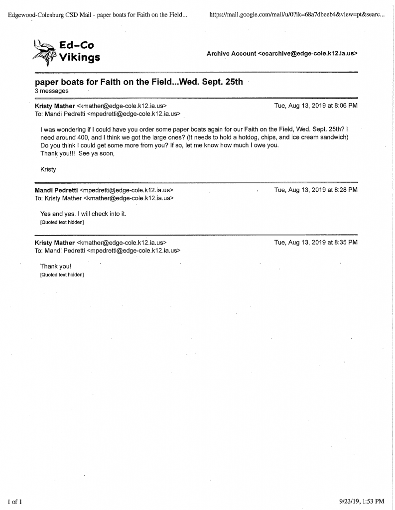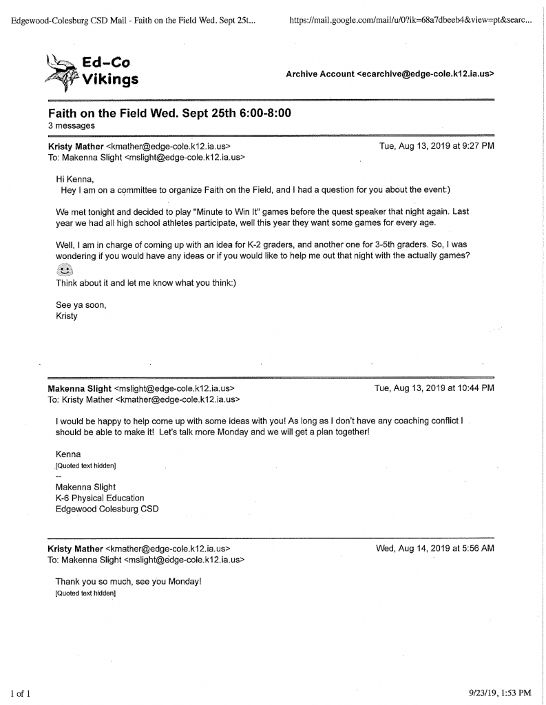 “We met tonight to start to plan this event again,” she admitted in an August 13 email to Superintendent Busch and Principal Dawn R. Voss. On the same date, she discussed speakers with guidance counselors Karla Trenkamp and Morgan Weaver and asked about including them in the event. Also on August 13, Athletic Director Roger Wright agreed to help Mather “with the lights, and keys for the concession stand,” while Food Service Director Mandi Pedretti promised to provide 400 paper food trays. In addition, Mather and physical education teacher Makenna Slight agreed to devise games together for the event.
