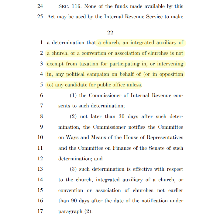 But just as important is the promise of equality under the law. And that promise is betrayed by Section 116 of this bill. It gives special treatment to churches and allows them, but not other charitable groups and nonprofits, to wade into politics while keeping their tax-exempt status.